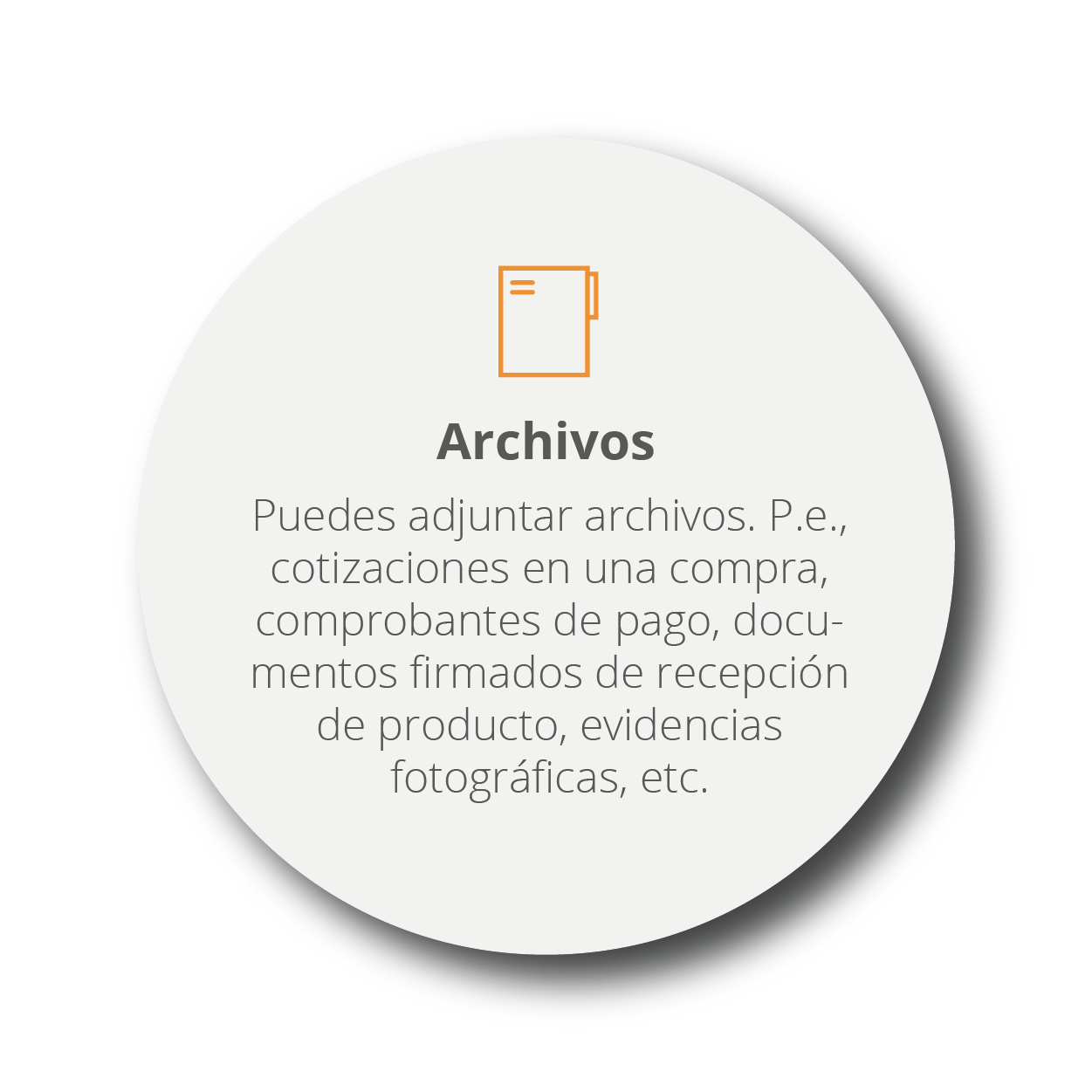 Puedes adjuntar archivos. P.e., cotizaciones en una compra, comprobantes de pago, documentos firmados de recepción de producto, evidencias fotográficas, etc.